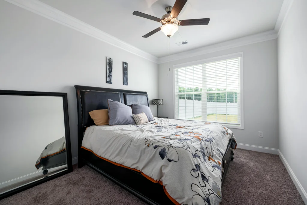 A fantastic example of a room with bold and dramatic flair. The dark leather headboard and large black mirror create a strong focal point. This is perfectly balanced by the light-colored walls and carpet, which keep the room from feeling too dark. The bedding with its floral pattern adds a touch of softness and artistic style, and I love how the orange tones in the pattern tie in with the pillow accents. This room shows that you can use dark furniture to make a powerful statement while still keeping the space feeling open and inviting.