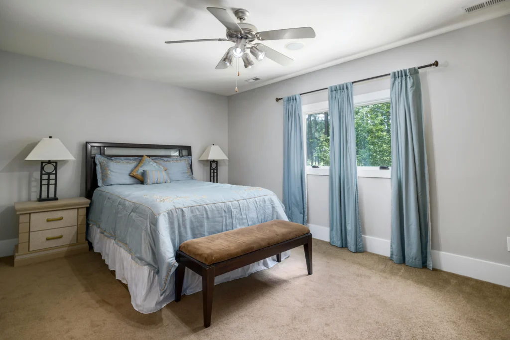 is all about classic elegance. The soothing blue bedding and curtains create a cohesive and calming color scheme. The beautiful embroidered details on the bedding add a touch of luxury and a more traditional feel. The two matching bedside lamps provide a sense of symmetry and balance, which is very pleasing to the eye. The large ceiling fan is both functional and stylish, making the room feel comfortable. This space is a great example of how to create a timeless look that feels both sophisticated and completely comfortable.