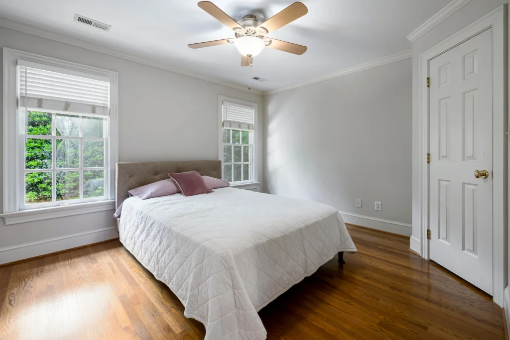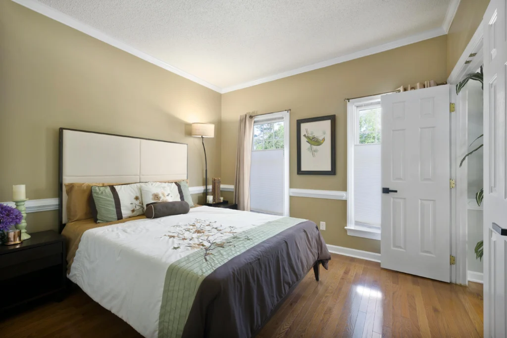 is a beautiful showcase of how to make a room feel warm and bright using natural elements. The stunning hardwood floors are the first thing that catches your eye, adding a natural warmth to the space. The large windows let in tons of natural light, making the room feel open and connected to the outdoors. The simple, light-colored bed with its soft bedding maintains an airy feeling. This room proves that sometimes, less is more. The simple design allows the beautiful features of the room, like the floors and windows, to truly shine.