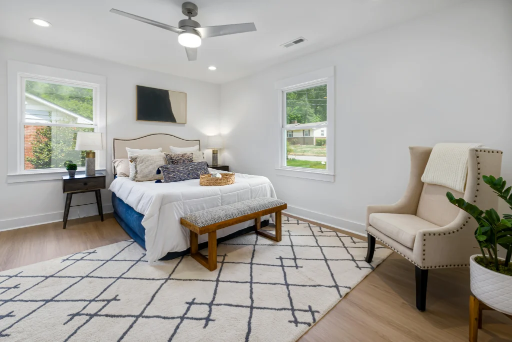 shows how a simple color palette can create a clean and modern look. The combination of white walls and light wood floors makes the room feel airy and spacious. The bed, with its clean lines and simple white duvet, is the focal point, while the interesting rug with its geometric pattern adds a cool, modern touch and helps to define the space. The chair and the bench at the foot of the bed add extra seating and a touch of warmth with their wooden accents. The two large windows fill the room with natural light, keeping the space from feeling sterile. It’s a perfect example of a minimalist style that is still very cozy and functional.