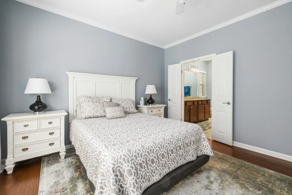 A wonderful example of using cool tones to create a serene and stylish bedroom. The light blue walls and the crisp white furniture create a fresh, clean look. The patterned bedding adds a touch of visual interest and keeps the room from feeling too simple. The dark wood floors provide a grounding contrast to the lighter elements in the room. This space feels both modern and traditional at the same time, making it a great choice for many different tastes. The open doors leading to the bathroom also create a sense of flow and space.