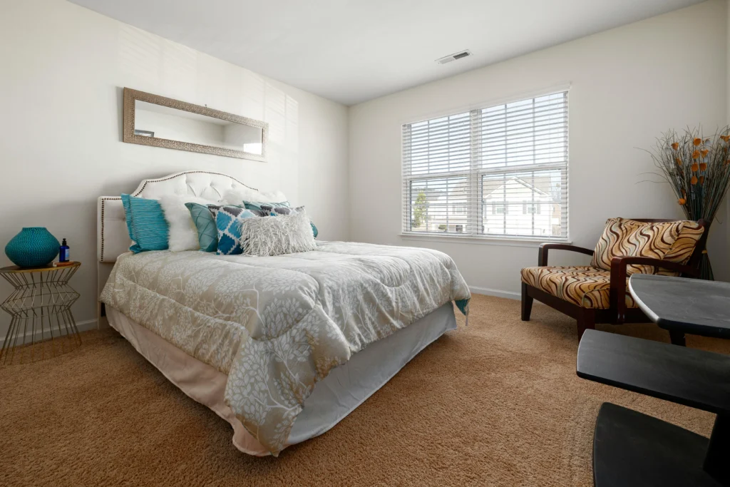I love how this room feels so bright and welcoming. The plush, textured pillows on the bed add a layer of comfort and style. The mix of teal and white creates a soothing contrast against the warm, beige walls and carpet. A great tip here is to play with textures; the mix of the fluffy white pillow, the woven throw, and the smooth bedding makes the room feel rich and inviting without being cluttered. Notice how the large mirror over the bed also helps make the room feel bigger and brighter by reflecting light from the window. The patterned chair in the corner is a great way to introduce a fun accent piece and add a pop of personality.