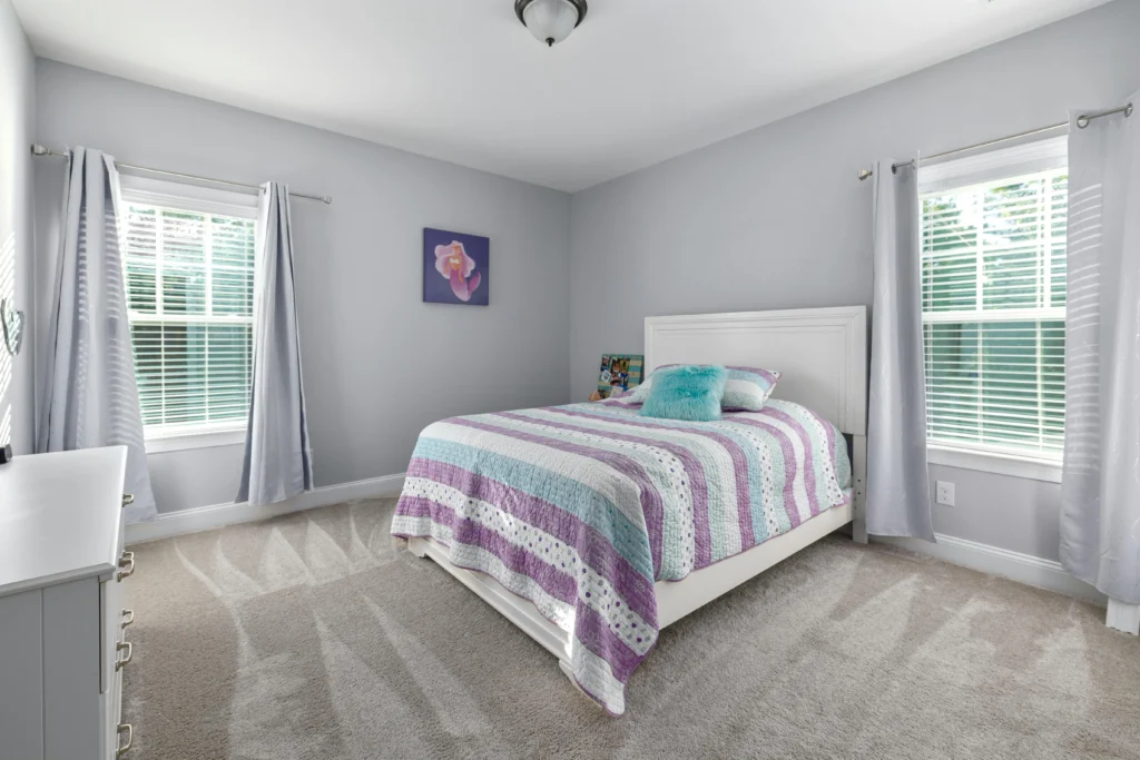 shows that a little color can go a long way. The soft gray walls and light-colored carpet provide a great neutral base, allowing the fun, colorful elements to stand out. The purple, blue, and white striped comforter is the star of the show here, giving the room a playful and vibrant feel. The simple white furniture keeps the look clean and doesn’t compete with the bedding. The curtains and wall art add extra touches of color and personality. It’s a great example of a space that is both stylish and fun.