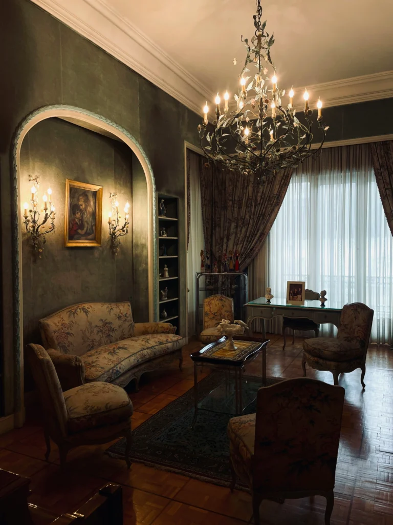 This room is a journey back in time, filled with classic elegance and charm. The beautiful floral pattern on the couch and chairs gives the space a soft, romantic feel. The vintage chandelier is absolutely stunning, casting a warm glow and adding a touch of old-world grandeur. The arched doorway and the intricate moldings on the walls give the room a sense of history and sophistication. This is a space that feels both formal and incredibly personal, proving that timeless design never goes out of style.