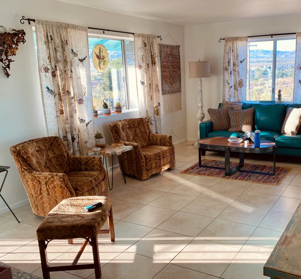 This room feels like a cozy, sun-drenched escape. The vibrant teal couch is a fun and unexpected color choice that anchors the room, while the patterned, vintage-style armchairs add a touch of rustic charm. The mix of textures and prints, from the throw pillows to the decorative curtains, creates a warm and lived-in feel. The big windows let in a ton of natural light, and you can even see a beautiful mountain view! This space is all about combining different styles and pieces to create a unique and personal aesthetic. It’s a reminder that your home should reflect the things you love, no matter how different they are.