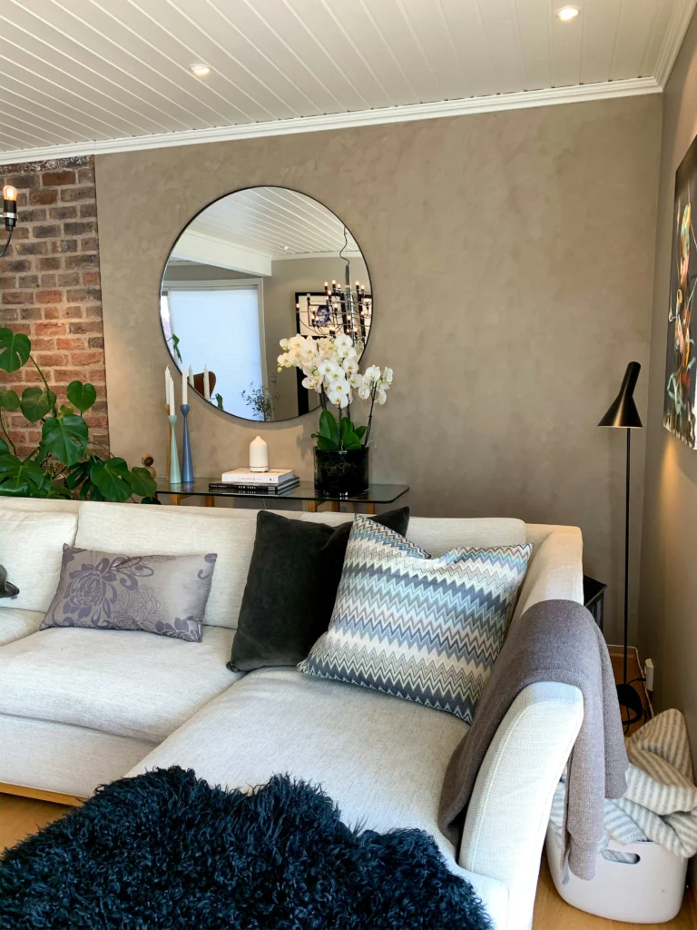 Minimalist yet warm, this room is a true oasis. The large, round mirror is a brilliant design choice, reflecting light and making the space feel open and bright. The textured gray wall adds depth and a sophisticated touch without being overwhelming. The simple, clean lines of the couch are complemented by the mix of pillows, which introduce subtle patterns and a bit of playful personality. This is a great example of how to create a calm and inviting space using a neutral color palette. The pop of green from the plants and the white orchids adds a fresh, natural element that brings the whole look to life.