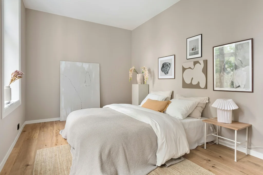 This bedroom feels so artistic and serene. The overall vibe is minimalist, but the carefully chosen art pieces and layered textures keep it from feeling cold or empty. The earthy tones of the walls, bedding, and rug create a warm, calming atmosphere. I love the gallery wall above the bed, which adds a personal touch and visual interest without overwhelming the space. The simple wooden nightstand and the unique lamp give the room a modern, Scandinavian-inspired feel. To get this look, start with a neutral color palette and then add layers of texture through your bedding, rugs, and art. The key is to be intentional with every piece you add, making sure it contributes to the overall feeling of peace and simplicity.