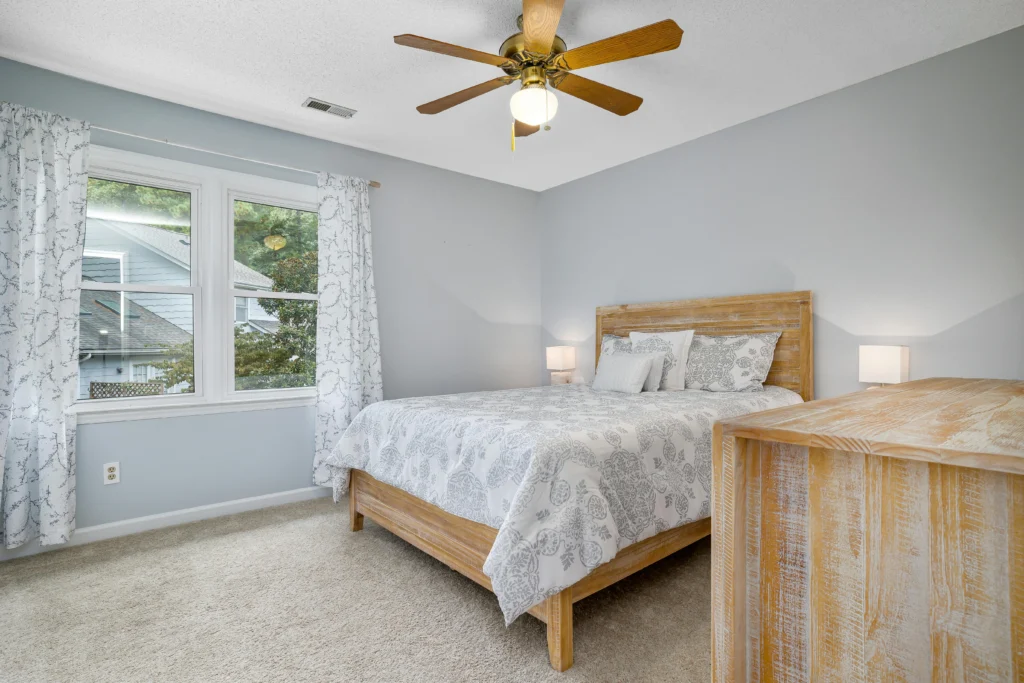 This room has such a warm, homey feel, and it’s all thanks to the combination of wood tones and soft textures. The standout piece is the wooden bed frame, which brings a natural, rustic element to the space. It pairs perfectly with the matching wood dresser, creating a cohesive look. The light blue walls and the gray and white floral duvet create a serene backdrop that’s easy on the eyes. The classic ceiling fan is a practical touch that also adds to the traditional charm. If you’re looking to create a similar vibe, choose a wooden bed frame as your focal point and build your color scheme around it. Opt for subtle patterns and neutral-toned curtains to keep the space feeling balanced and relaxed.