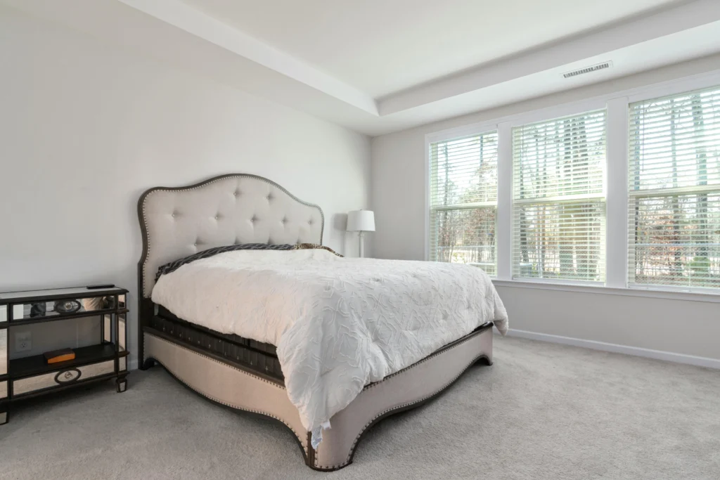This bedroom is all about sleek lines and a clean aesthetic. The star of the show is the upholstered bed with a high tufted headboard, which adds a touch of elegance and sophistication. The low-profile bedside table with its reflective surface complements the modern feel without taking up a lot of visual space. The minimalist decor and crisp white bedding keep the room feeling airy and open. The key to this look is simplicity. To achieve this, choose a few high-impact pieces of furniture and keep the rest of the room free from clutter. Opt for a neutral color palette like grays, whites, and creams, and let the textures of your furniture and bedding do the talking. The large windows and Venetian blinds are also perfect for controlling natural light while maintaining a clean, streamlined look.