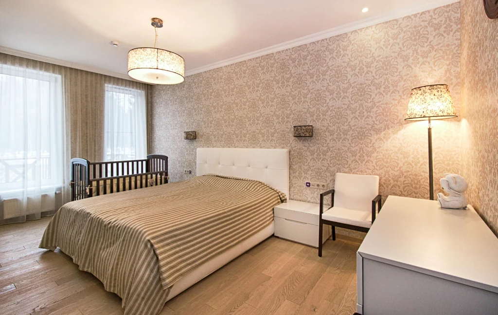 This room is a perfect example of how a simple color palette can create a sophisticated and peaceful space. The neutral tones—from the cream-colored walls to the light wood floors—make the room feel bright and airy. The subtle patterned wallpaper and textured throw blanket add interest without being overwhelming. The addition of the baby’s crib shows how you can blend different functions seamlessly into a stylish design.
