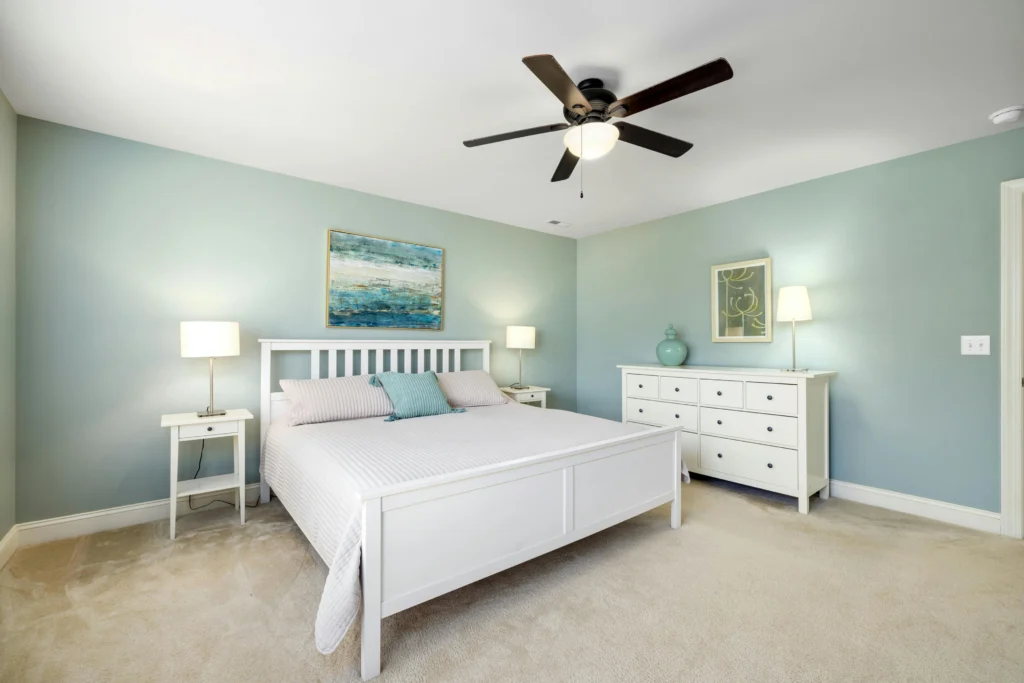 Doesn’t this room just make you feel instantly relaxed? The soft, seafoam green walls are absolutely stunning and create such a tranquil, coastal vibe. The crisp white furniture and bedding stand out beautifully against the colored walls, keeping the space feeling fresh and clean. The art above the bed and dresser ties into the color palette perfectly, adding a subtle touch of blue and turquoise. I especially love the large vase on the dresser—it’s such a simple yet elegant detail. This bedroom is a wonderful example of how to use a single color to set the mood for an entire room. It’s a peaceful and stylish retreat.