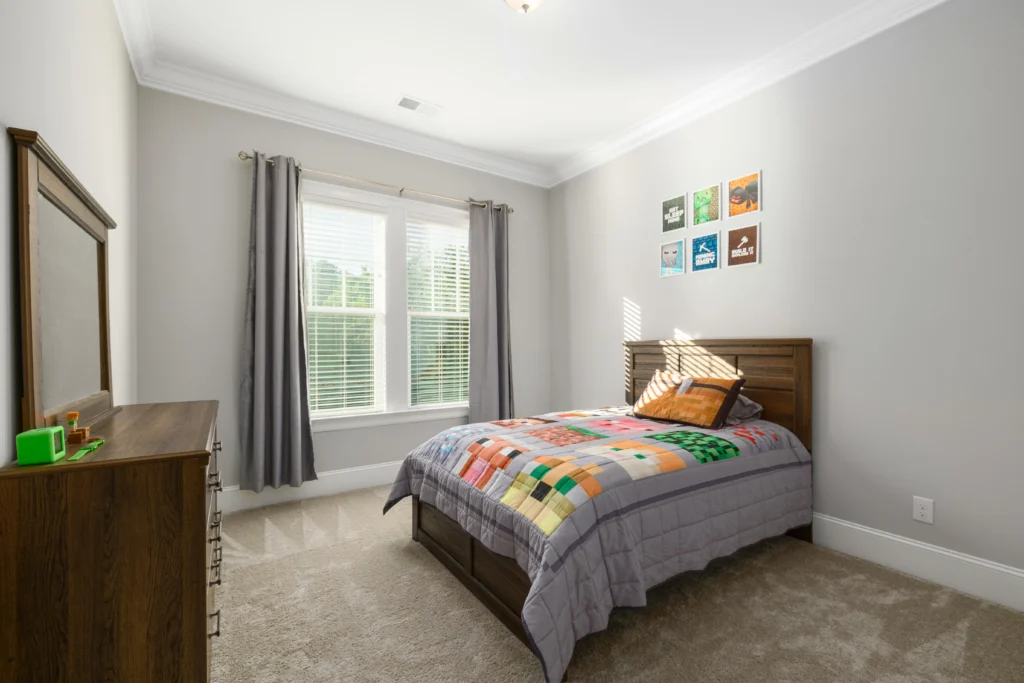 This bedroom is all about fun and personality! The gray walls and wood furniture create a simple, clean base, but the real star of the show is that colorful quilt. The mix of bright squares adds so much energy and charm to the room. It just goes to show that you don’t need a lot of fancy decor to make a space feel special. I also love the collection of framed prints on the wall—they add a youthful, creative touch. This room is a fantastic reminder to let your personal style shine through, whether it’s with a bold blanket or a favorite piece of art. It’s a space that feels lived-in and loved.Modern Minimalism