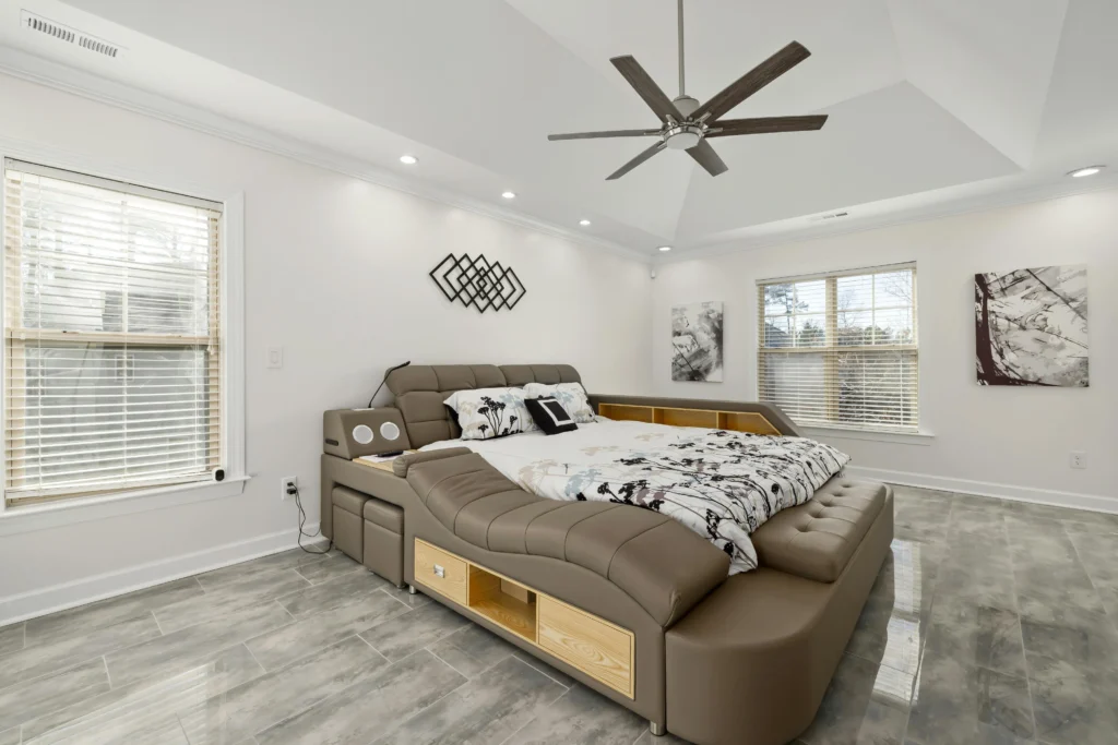 This bedroom is a total showstopper! The first thing you notice is that amazing bed—it looks more like a high-tech lounge than a place to sleep, with built-in storage and even speakers. The sleek, gray tile floor and white walls give the room a very modern, almost futuristic feel. The geometric wall art adds a cool, edgy vibe that complements the bed’s design. And of course, the ceiling fan is a sleek touch that’s both functional and stylish. This is a great space for anyone who loves a minimalist, contemporary look and isn’t afraid to make a bold statement with their furniture.