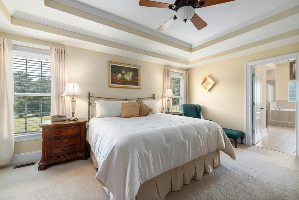 This room feels so grand and elegant, yet still incredibly welcoming. The buttery yellow walls and creamy trim create a warm, sunny atmosphere that’s just so inviting. The traditional, dark wood furniture grounds the space and gives it a timeless feel, while the plush white bedding keeps things feeling fresh and modern. Take note of the beautiful art above the bed—it ties the whole color scheme together. And check out that fancy tray ceiling! It adds so much architectural interest and makes the room feel even more spacious. This bedroom is a great example of how you can blend classic and contemporary elements to create a look that’s both sophisticated and cozy.