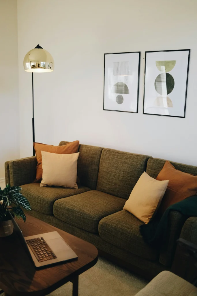 This is such a lovely, bright space! The white walls make the room feel open and airy, and they serve as a great backdrop for the beautiful artwork. The olive-green sofa and warm-toned pillows create a welcoming and comfortable seating area. The silver-hued floor lamp with its reflective shade is a unique touch that adds a bit of glamour and helps to bounce light around the room. I love how a simple potted plant on the coffee table adds a pop of natural color. It’s a perfect example of a minimalist approach that still feels warm and full of personality.