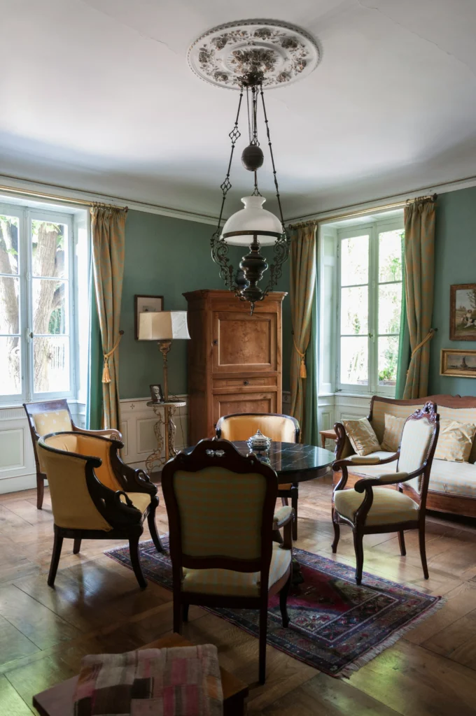Talk about a room with a story! This space has a beautiful, old-world charm that feels both grand and intimate. The mint-green walls and tall windows let in so much natural light, and the heavy drapes add a sense of luxury. I’m completely smitten with the antique chandelier and the gorgeous, dark wood armoire. The round table and chairs in the center feel like the perfect spot for a game of cards or a cup of tea. It’s a testament to how you can mix different styles and eras to create something truly unique and personal.