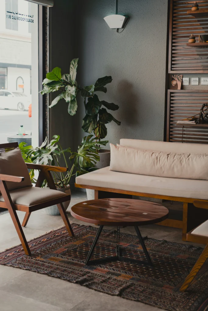 This room is a masterclass in blending textures and natural materials. The grey walls and industrial window frame are softened by the warm wood tones of the furniture and the lush greenery of the plants. The chunky, low-profile couch looks incredibly comfortable, and the geometric pattern of the rug anchors the whole space beautifully. I particularly love the chair with the cane back and the small, wooden coffee table—they add an organic, handcrafted feel. It’s a stylish, contemporary space that still feels incredibly welcoming and relaxed.