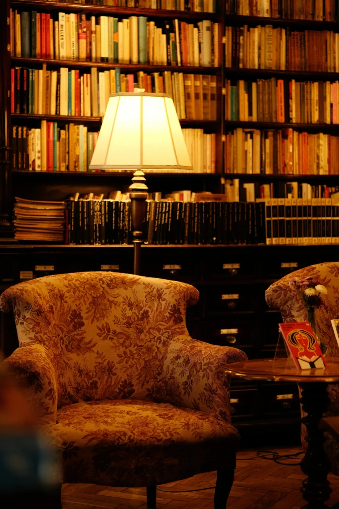 This is the kind of room that makes you want to grab a good book and a cup of tea. The floor-to-ceiling bookshelves are absolutely magnificent, creating a warm, library-like atmosphere. The rich, wood tones and the soft lighting from the lamp give the space a cozy, intimate glow. The armchair with the floral pattern is so classic and comfortable-looking, it just begs you to sink in and stay a while. This room proves that a well-loved collection of books can be the most beautiful decor of all.
