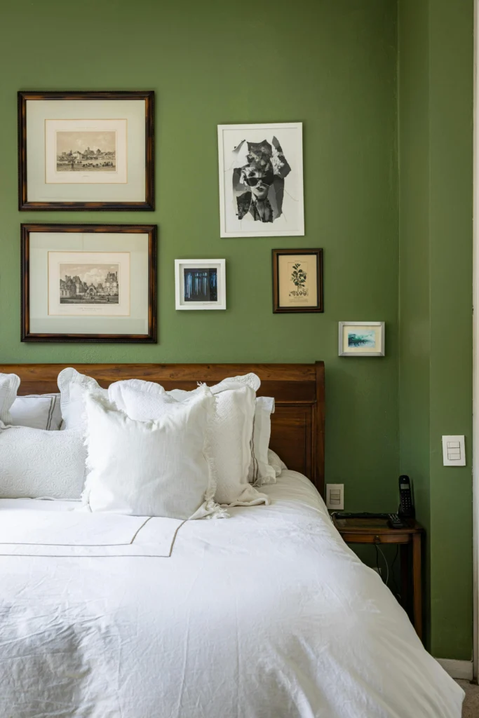 This room is all about personality and color. The bold, olive-green walls create a dramatic backdrop for the collection of framed art. I love the gallery wall—it’s a great way to show off your style and make a room feel personal. The wooden bed frame and nightstand add a classic touch, and the white pillows and bedding pop against the dark wall, making the bed look incredibly inviting. This space feels both sophisticated and lived-in, like a cozy, art-filled sanctuary.