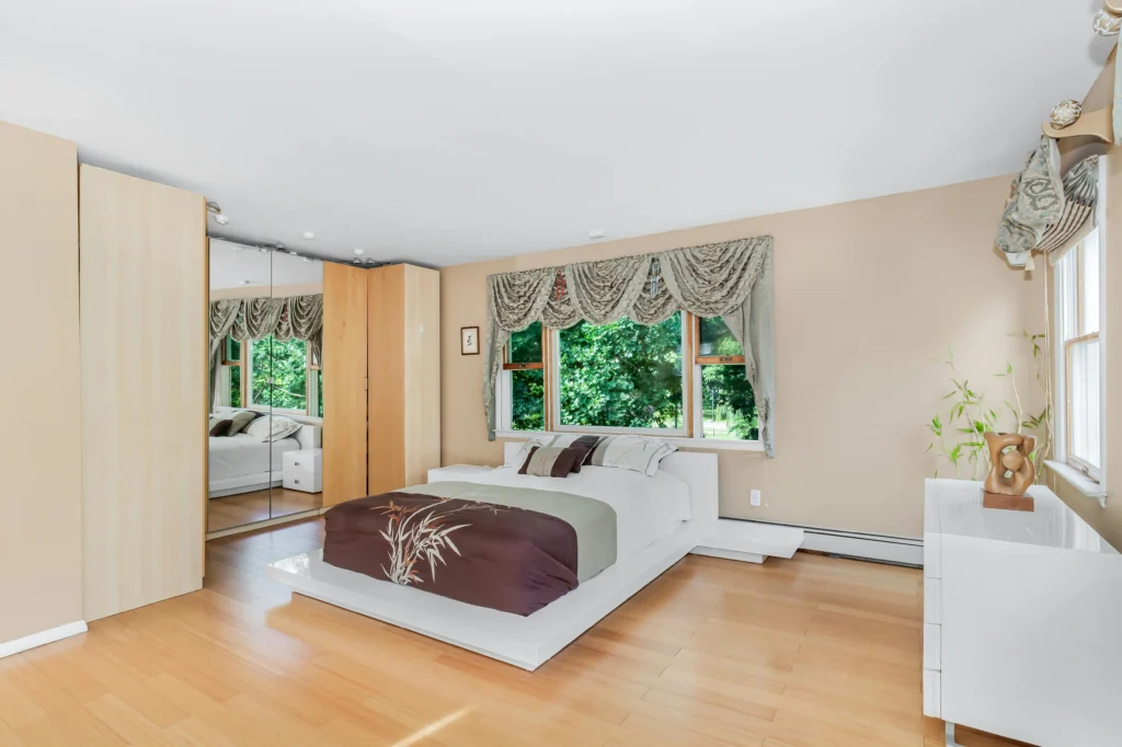 If you’re all about clean lines and simplicity, this one’s for you. The light wood floors and neutral walls create a calm, airy feeling that’s so refreshing. The low-profile platform bed and floating nightstands keep the space feeling open and uncluttered. I love how the large windows bring in tons of natural light and connect the room to the outdoors. The large mirrored closet doors not only provide storage but also make the room feel twice as big. This bedroom proves that you don’t need a lot of decor to make a big impact—it’s all about creating a peaceful, minimalist haven.