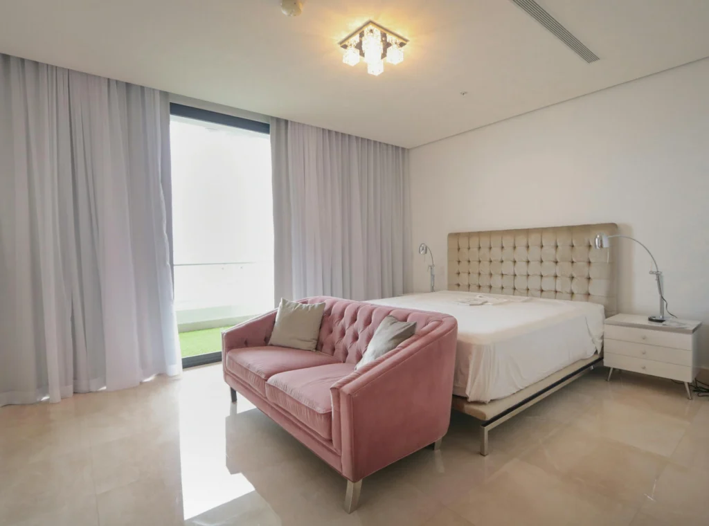 This room is a study in quiet elegance. The soft, muted tones of the pink sofa and tufted headboard create a soothing and sophisticated palette. I love how the plush textures of the sofa and headboard make the space feel incredibly comfortable and inviting. The simple, white bedding and clean-lined nightstands keep the focus on the beautiful textures and soft colors. And those floor-to-ceiling drapes? They make the room feel so grand and help frame the beautiful view. It’s the perfect place to unwind after a long day.