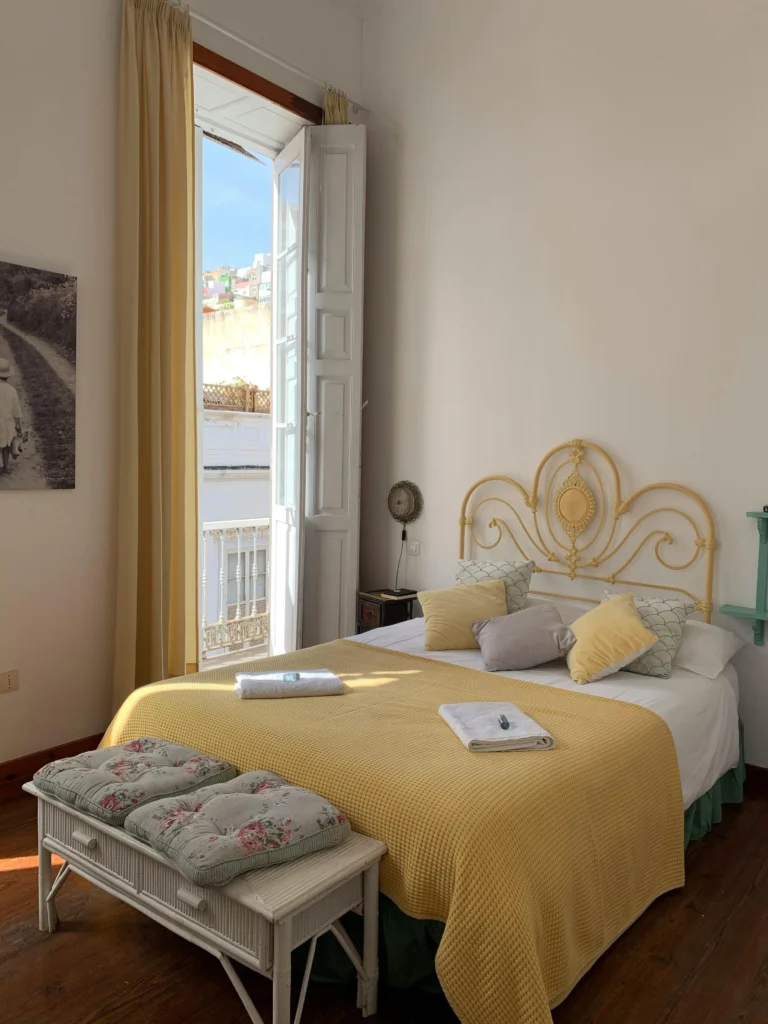 This bedroom just radiates warmth and sunshine. The cheerful yellow on the bed and pillows, combined with the bright natural light pouring in from the balcony doors, makes the whole space feel so happy. I adore the detailed, vintage-inspired headboard—it adds a touch of romantic charm. The simple, crisp white bedding keeps the look clean, while the floral-patterned bench at the foot of the bed adds a cozy, welcoming feel. Imagine waking up here, opening those doors, and stepping out onto the balcony—pure bliss!