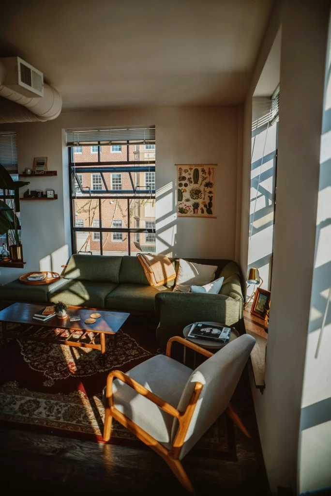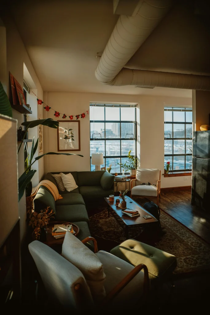 This is another shot of that fantastic industrial loft, but from a different angle. It really shows off the open-concept living space and the blend of styles. The exposed ductwork, large windows, and floating shelves give it a cool, urban edge, while the comfortable green sectional and cozy rug make it feel like a real home. The mix of vintage and modern pieces, along with the plants and personal touches, makes this space so unique and inviting.