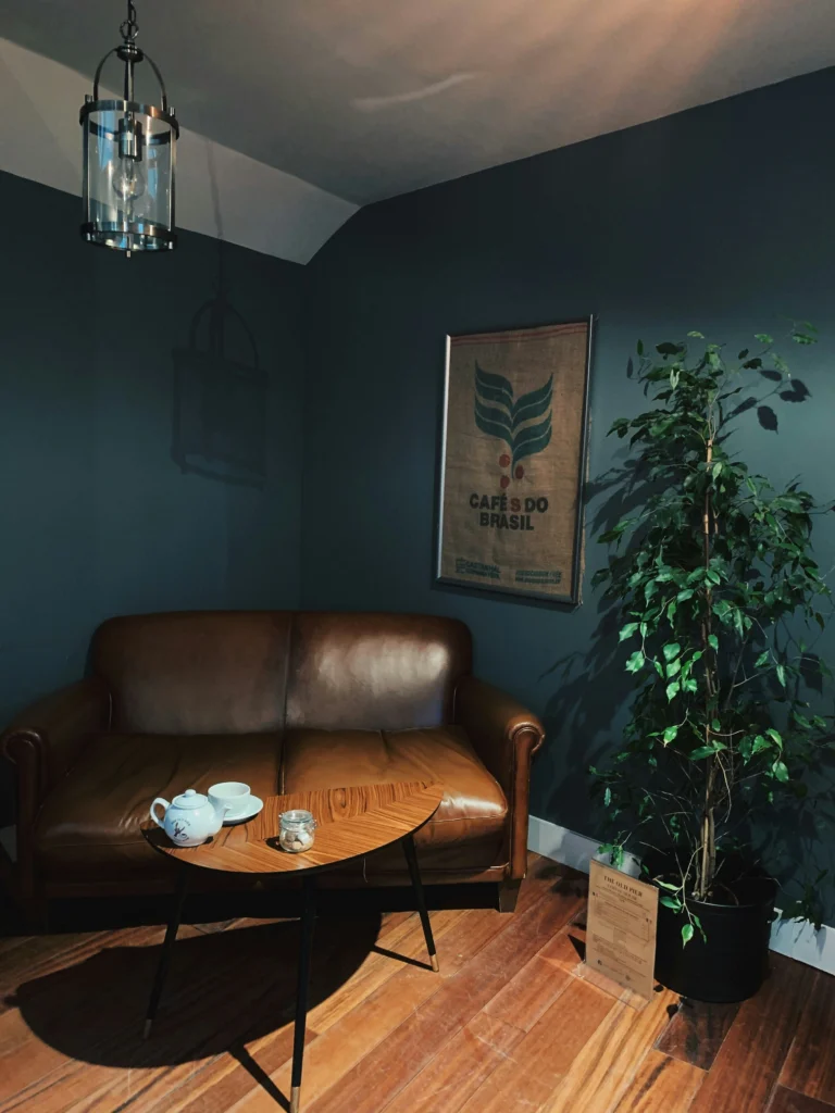 This room feels like a chic, intimate café. The dark, teal-blue walls are so elegant and dramatic. I love the rich, caramel-colored leather sofa—it’s a classic piece that never goes out of style. The stylish coffee table and the framed coffee sack on the wall are perfect touches that complete the look. The large plant adds a bit of life to the space. It’s a perfect little corner for a coffee date or a solo moment of reflection.