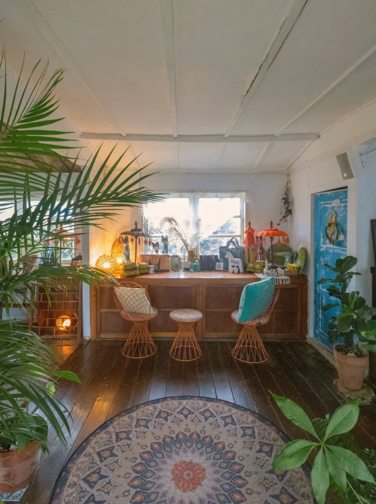 This room has such a wonderful, free-spirited vibe. The dark wood floors and the bright white walls create a beautiful contrast. I love the round, patterned rug, which adds a bohemian touch, and the mix of woven chairs and a stool. The console table is filled with so many interesting and personal items, and the plants create a lush, jungle-like feel. The blue door adds a fantastic pop of color. This is a space that feels full of stories and creativity.