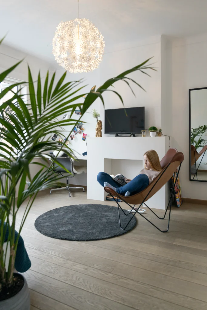This space is so versatile and chic! It seamlessly combines a home office with a cozy lounge area. The clean, white console with the TV and the minimalist desk is a great, space-saving solution. I’m a huge fan of the leather butterfly chair, which looks incredibly comfortable and stylish. The large, round rug anchors the seating area, and the oversized light fixture adds a cool, modern feel. This is a perfect example of how to design a multi-functional room that feels both organized and relaxing.
