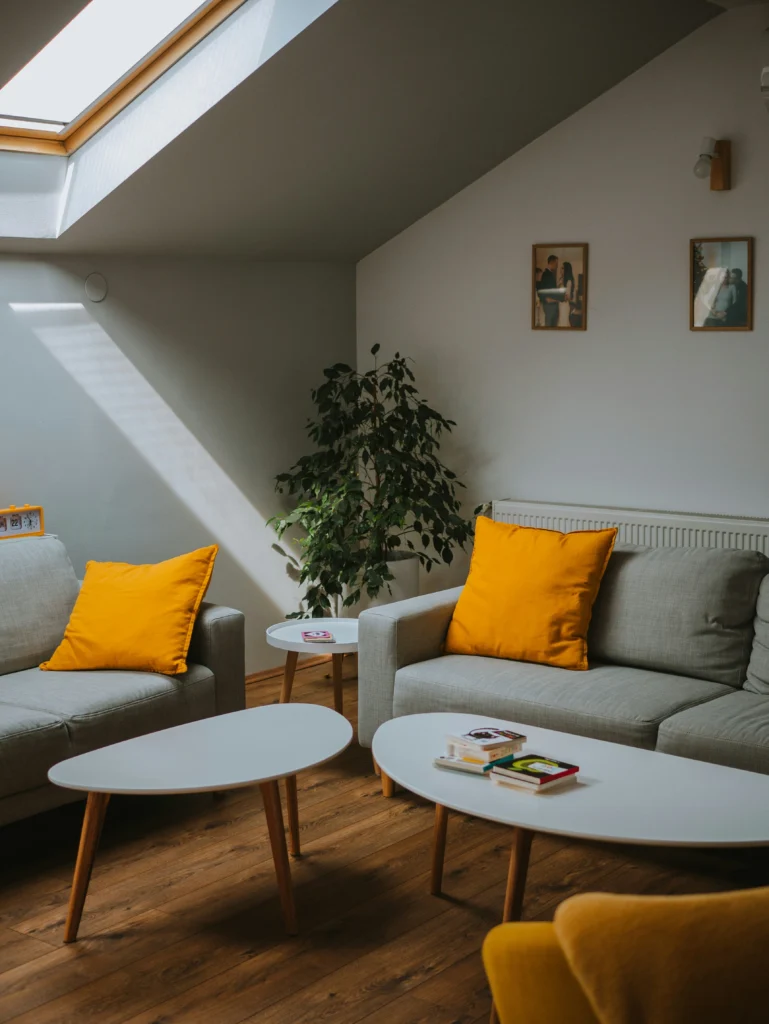 This room is a great example of how a little bit of color can go a long way. The neutral gray couches provide a calm foundation, but the bright yellow throw pillows are what really make this space sing! The natural light streaming in from the skylight and the simple wood floors create a warm and inviting atmosphere. I love the clean lines of the coffee tables, which give the room a modern feel. It’s a perfect spot to relax with a book and feel a little burst of sunshine.
