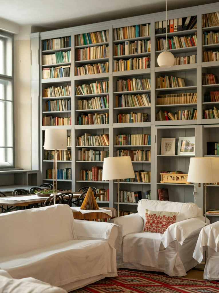 This room is a book lover’s dream! The floor-to-ceiling built-in bookshelves are absolutely stunning and make the room feel like a classic, intellectual retreat. The cozy, white slipcovered chairs and the plush red rug add a traditional and comfortable feel. The combination of old and new elements, like the modern lamps and the full shelves of books, gives the space a sense of history and warmth. It’s a beautiful, timeless room that is just begging you to sit down with a good book.