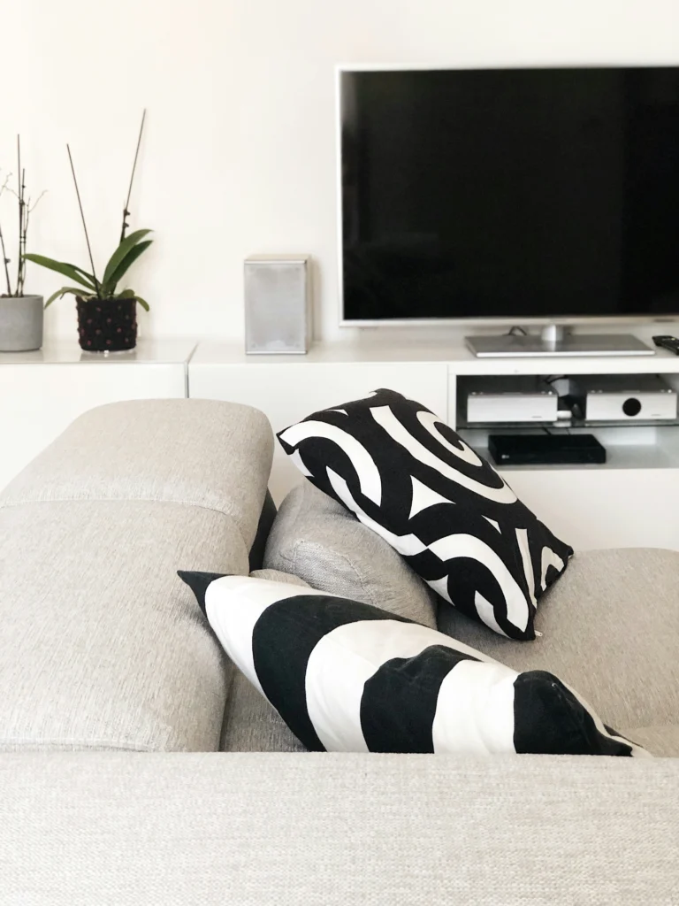 This room is a great example of how to make a minimalist space feel dynamic and interesting. The clean, white media console and TV create a simple backdrop. The magic happens with the pillows! The bold, black-and-white graphic patterns on the cushions add a huge dose of personality and visual interest. I love how they stand out against the light gray couch. It’s a perfect reminder that you don’t need a lot of clutter to create a stylish and impactful space.