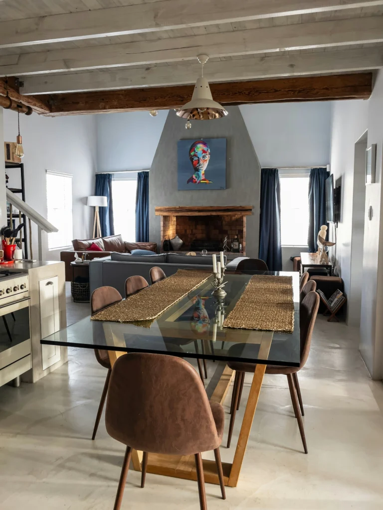 This open-plan space beautifully blends rustic and modern elements. The exposed wooden ceiling beams and the stone fireplace give the room a cozy, farmhouse-inspired feel. But then you have this fantastic modern dining area with a glass table and stylish chairs, and a bold, colorful painting above the fireplace. I love how the different zones are defined yet flow into each other seamlessly. This is a great inspiration for anyone looking to create a space that is both comfortable and stylish.