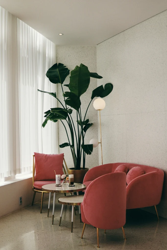 How incredibly charming is this seating area? The blush pink velvet chairs and sofa are so chic and inviting. The gold legs add a touch of glamour and sophistication. I love the minimalist coffee tables and the subtle terrazzo wall, which create a clean, modern backdrop. The large, potted plant adds a beautiful organic element and a pop of green that perfectly complements the pink furniture. This is the perfect spot for catching up with a friend over coffee.