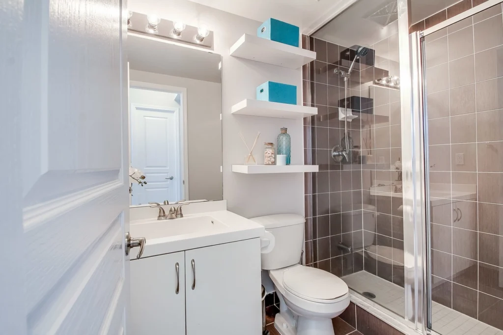 This bathroom is a great example of how to make a compact space feel open and bright. The clean white vanity and sink, along with the floating shelves, help to keep the floor clear and the room feeling less crowded. The pop of bright teal with the storage boxes adds a fun, modern twist, while the brown shower tile provides a nice contrast and texture.
