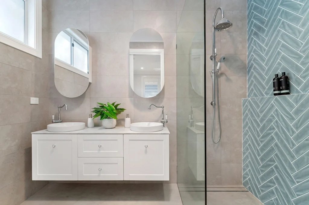 This bathroom is a dream for couples, with two separate sinks and mirrors. The oval mirrors and dual sinks create a symmetrical and balanced look. The light gray and blue chevron tiles in the shower add a touch of color and a modern pattern. The floating white vanity keeps the space feeling light and airy, while the potted plant brings a lovely natural element.