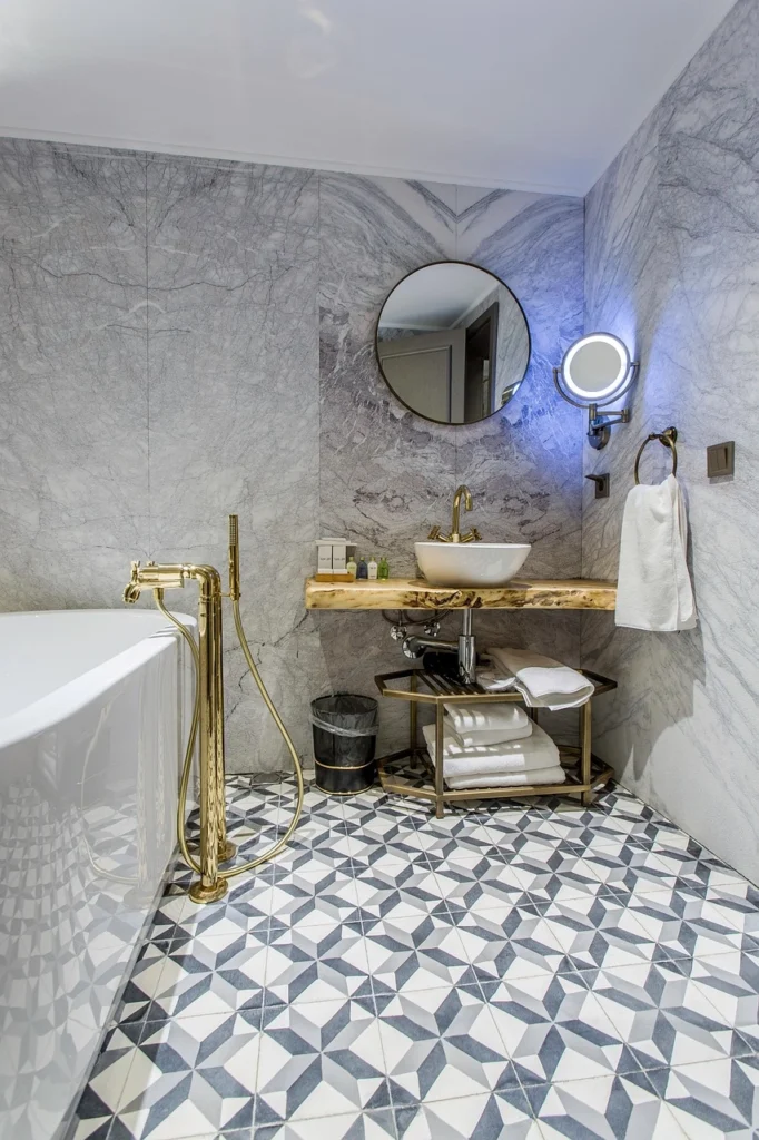 Wow, this bathroom is all about that luxurious touch! The gold fixtures immediately catch the eye and add a warm, sophisticated feel against the cool grey marble walls. The circular mirror and the geometric tile floor add so much visual interest and break up the textures perfectly. This look is all about mixing high-end materials with bold patterns. To achieve a similar vibe, don’t be afraid to mix metals; a gold faucet with a black frame mirror can look incredible. Invest in one standout piece like a unique light fixture or a vintage-inspired vanity. For the floor, a patterned tile can transform the entire room, making it feel more dynamic and personalized.