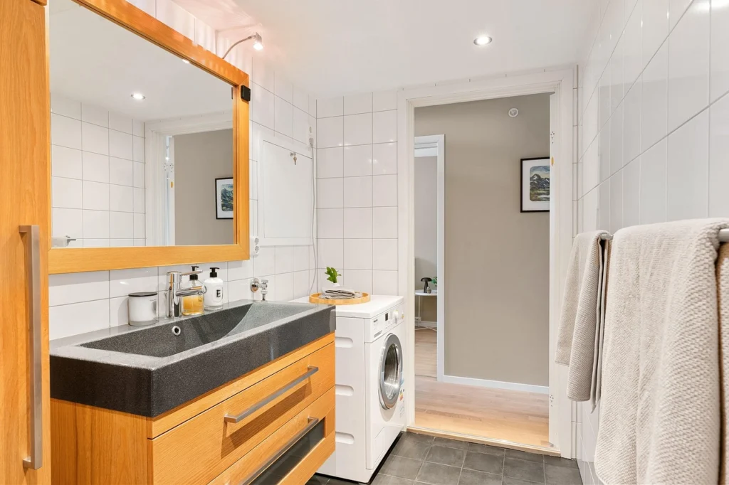This bathroom is all about making the most of a compact space. The smart layout includes a washing machine right next to the vanity, which is a great solution for smaller apartments or homes. The white subway tiles and simple wood vanity keep the space feeling bright and modern. The large mirror reflects light and makes the room appear bigger. To achieve this look, think about multifunctionality. Can you fit a washer/dryer combo in your bathroom? Choose a vanity with open shelving for easy access to towels or storage baskets. White subway tiles are a classic choice that are both affordable and timeless.